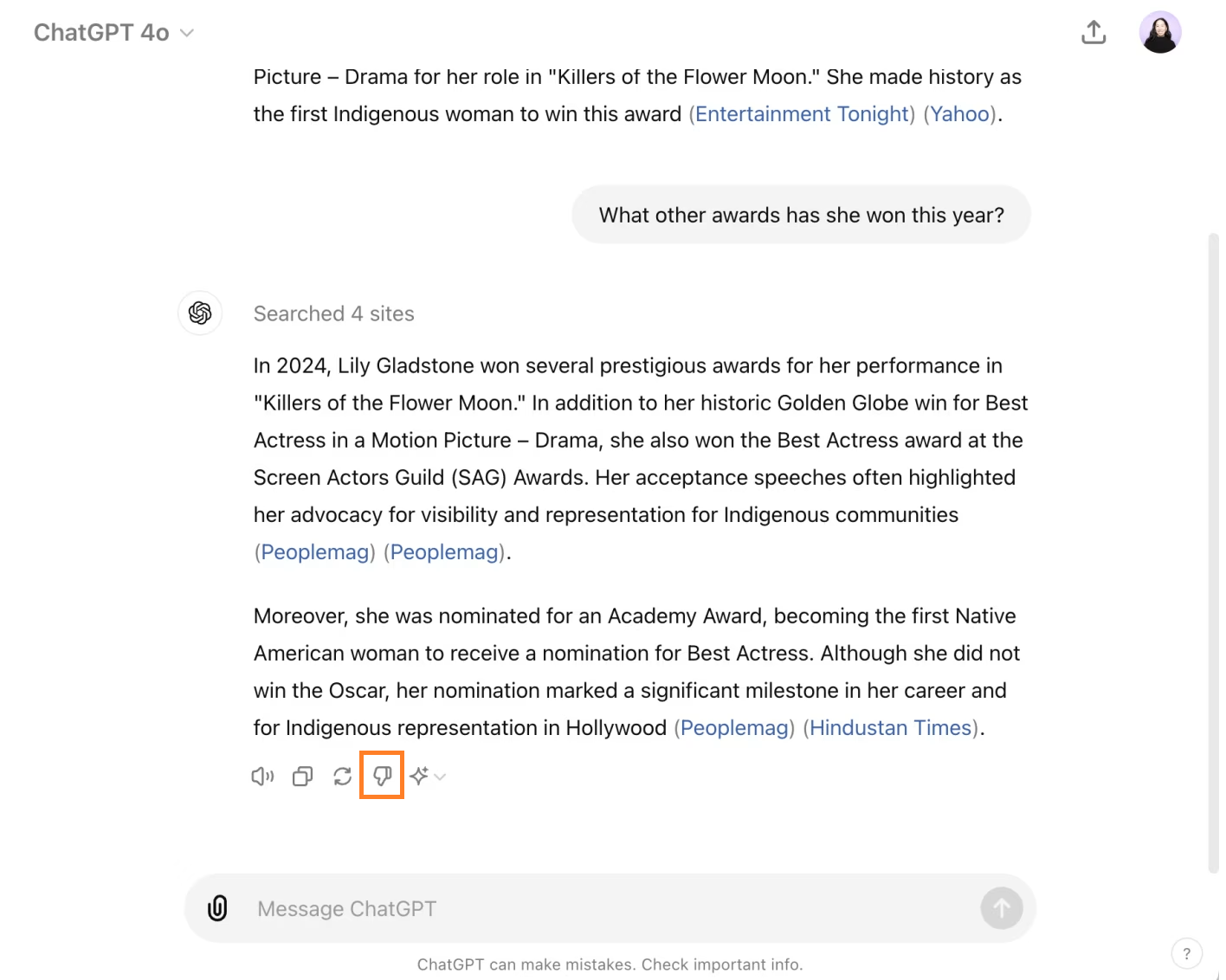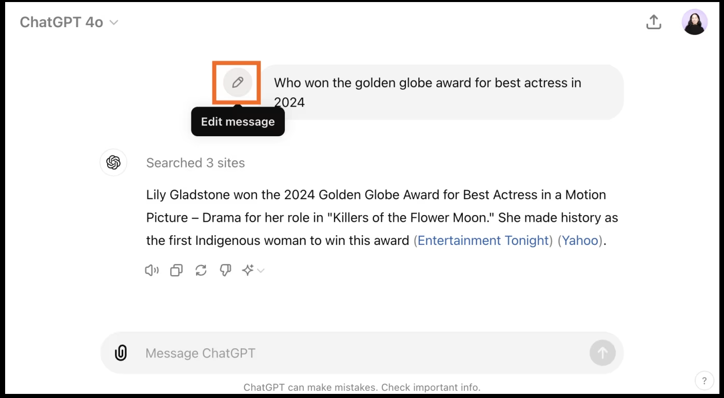 For example, after asking about an actress, I can continue with: "What other awards has she won this year?" ChatGPT will understand that I'm still referring to the same person from earlier in the conversation.